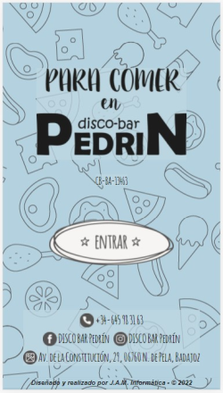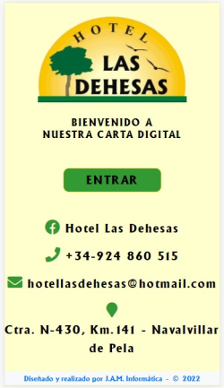 Algunos de nuestros trabajos DULCES RUIZ CARTA DIGITAL HOTEL DON JUAN CARTA DIGITAL DISCO BAR PEDRÍN CARTA DIGITAL HOTEL LAS DEHESAS CARTA DIGITAL GASTROBAR SCHC@S COMUNIDAD DE REGANTES CANAL DE LAS DEHESAS CLUB AD LACIMURGA COOPERATIVA DE TRANSPORTES "LA SERENA" CENTRO DE ENSEÑANZA PELEÑO ALREX (NAVALVILLAR DE PELA) MUÑOZ ASESORES